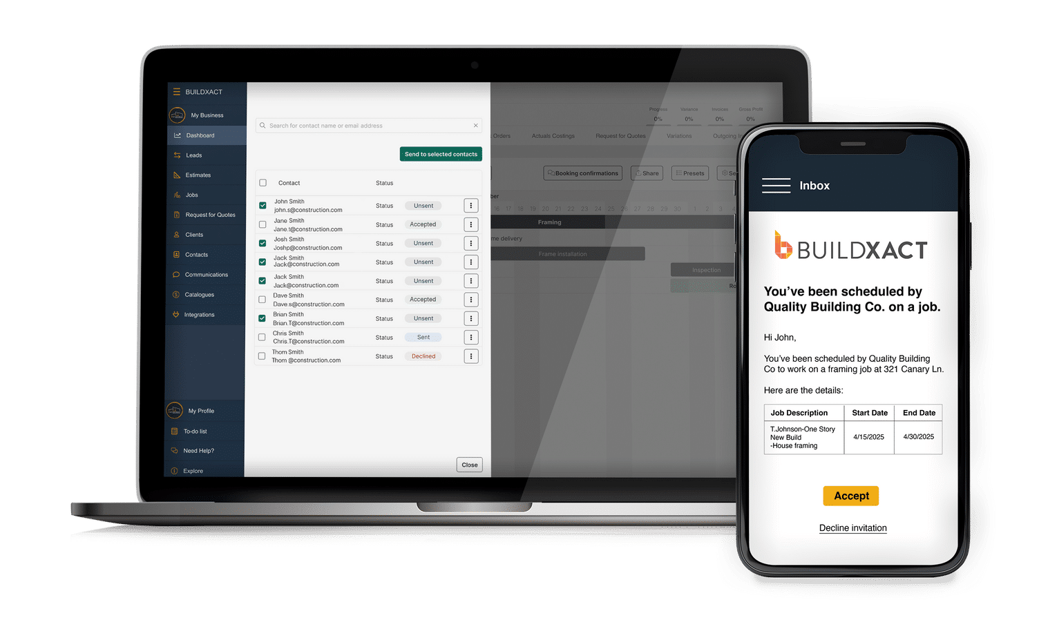 Use bulk emails to easily invite contractors to jobs. Get a clear view of who’s accepted and who hasn’t.