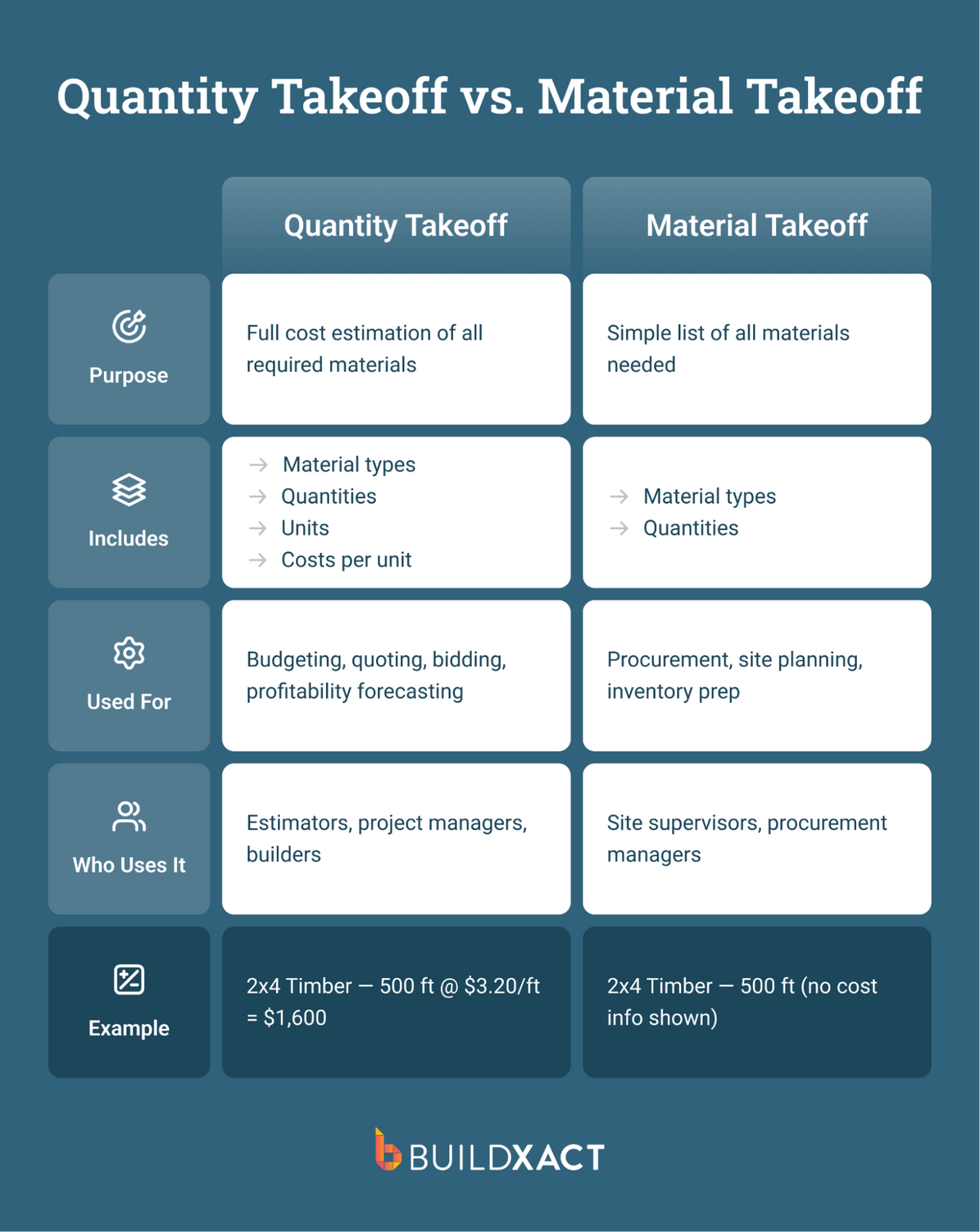 The terms “material takeoff” and “quantity takeoff” are often used interchangeably, but there’s a key distinction: