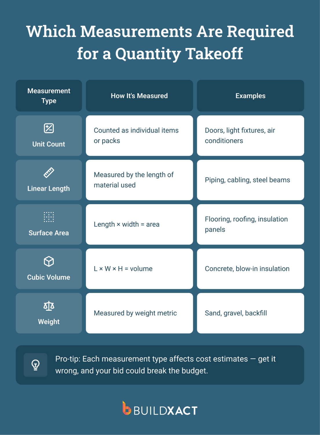 Understanding these measurement types ensures your material takeoff aligns with real-world purchasing and pricing. Here are the five standard measurement categories used in construction estimating: