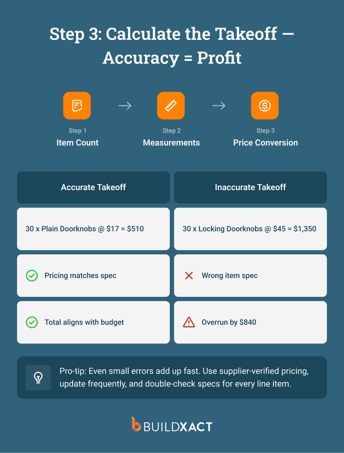 Detailed descriptions and accurate pricing are crucial for a precise quantity takeoff. Buying 30 plain doorknobs at $17 each differs significantly from buying 30 locking doorknobs at $45 each. That single pricing error creates an $840 budget gap.