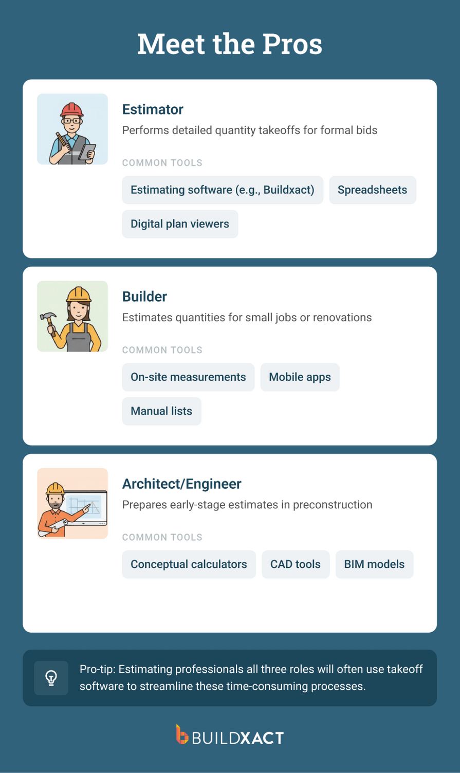 Anyone in charge of a project that requires materials needs to perform a quantity takeoff. A baker calculates ingredient costs before quoting a wedding cake. In construction, the same principle applies, but the person handling it depends on the project’s size and complexity.