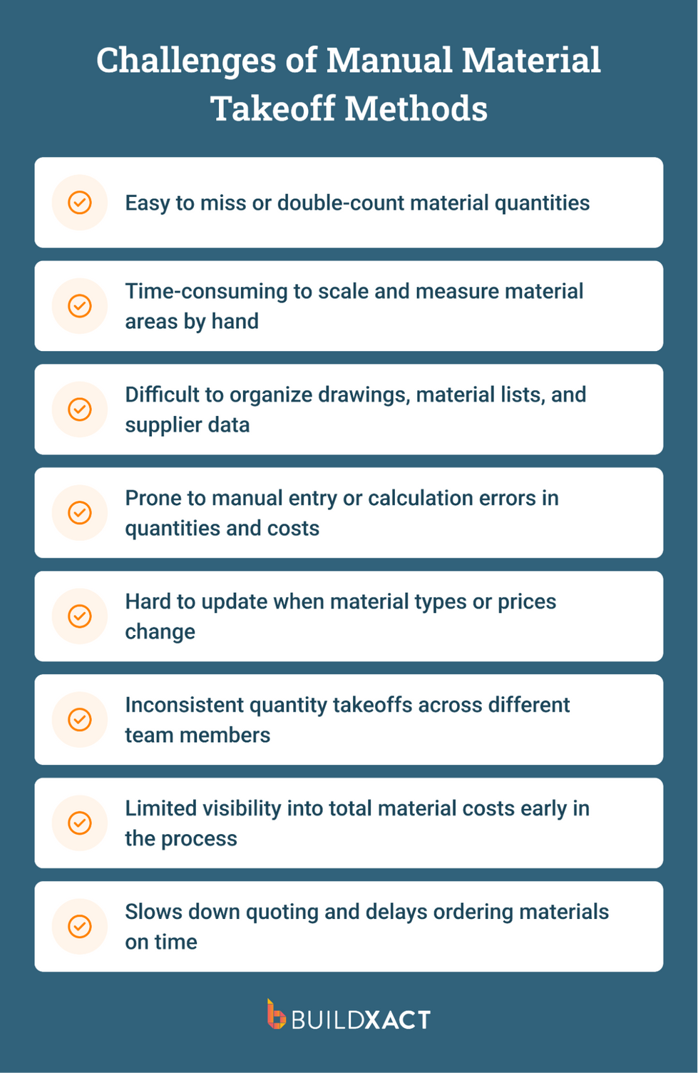 Below are some of the typical challenges builders encounter when performing takeoffs manually. In the next section, we’ll explore how these challenges can be overcome with automated takeoff software like Buildxact.