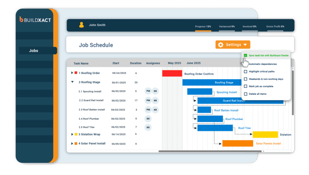 Buildxact job schedule screen displaying a Gantt chart of roofing tasks with timelines, assignees, and progress indicators, alongside a settings dropdown showing options like syncing tasks, automatic dependencies, and highlighting critical paths.