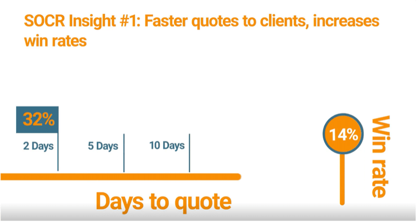 Buildxact takes four main insights from its State of the Customer Report. The first is that the technology enables faster quotes to clients, which is increasing win rates. The report shows that estimates that are sent to clients within 2 days have a 32% win rate, approximately 2 times faster than the industry standard. After 2 days, the win rate continues to decrease at a steady rate.